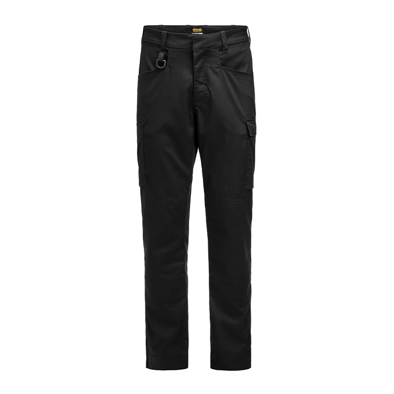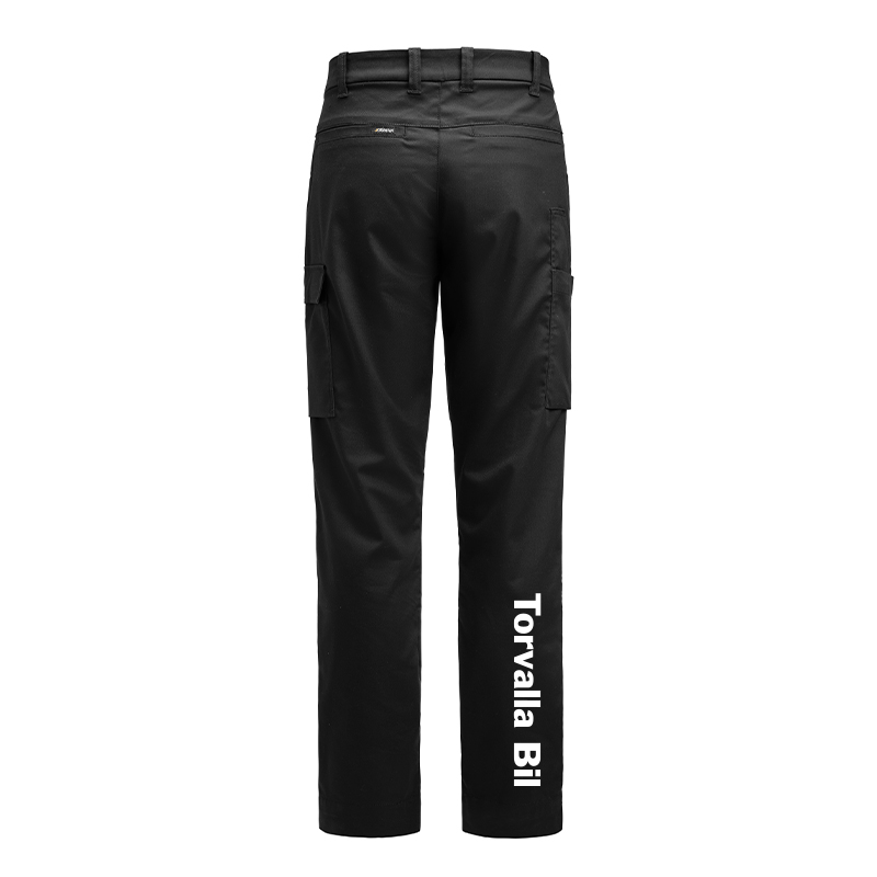 Servicebyxa med stretch. Dold knapp fram för ”Non-scratch” design. Benficka på högersida med plats för tumstock och benficka på vänster sida med ficklock med plats för pennor. D-ring i hällan fram för ID-korthållare. Knäskyddsficka på insidan.